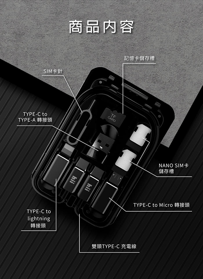 內含功能:多種類型數據線(支援PD快充)、卡片收納盒、無線充電、SIM工具組、讀卡機、手機支架、手電筒